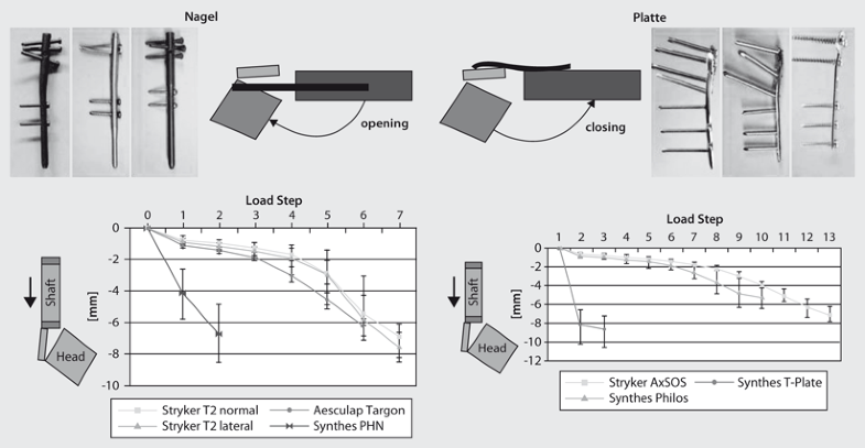 In eigenen biomechanischen Untersuchungen wurde der Vorteil winkelstabiler Systeme aufgezeigt. In einem eigens entwickelten Prüfstand wurden 9 verschiedene moderne winkelstabile Nagel- und Plattensysteme gegen die konventionelle T-Platte unter kraftgeregelter, schwellender Belastung in einem Treppenversuch bis zum Versagen belastet und ihre Überlegenheit in einer entsprechenden Fraktursituation nachgewiesen. Interessanterweise konnten implantatspezifische Charakteristiken wie die sekundäre Schraubenperforation ins Gelenk durch varische Kippung des Kopffragmentes bei Platten und das vermehrte Schwingen der exzentrischen, winkelstabilen Platten im Vergleich zu den Marknägeln simuliert werden (Abb. 1).