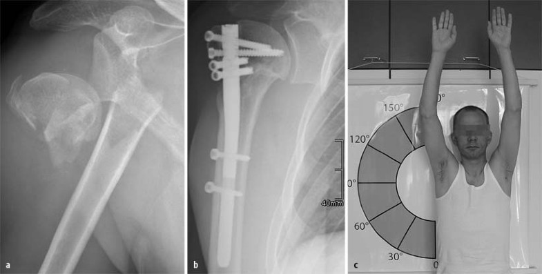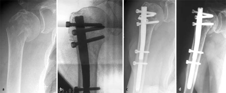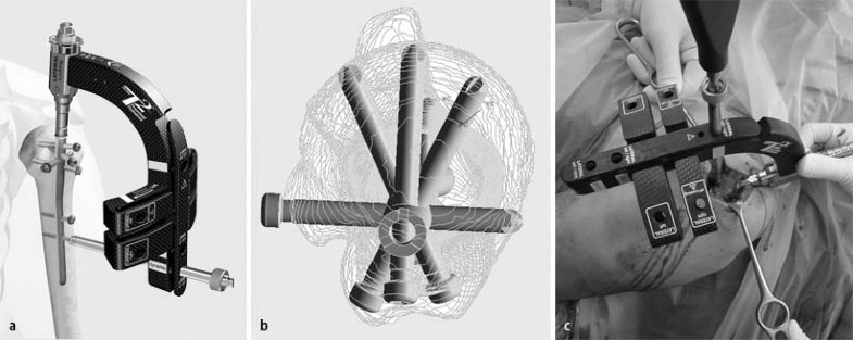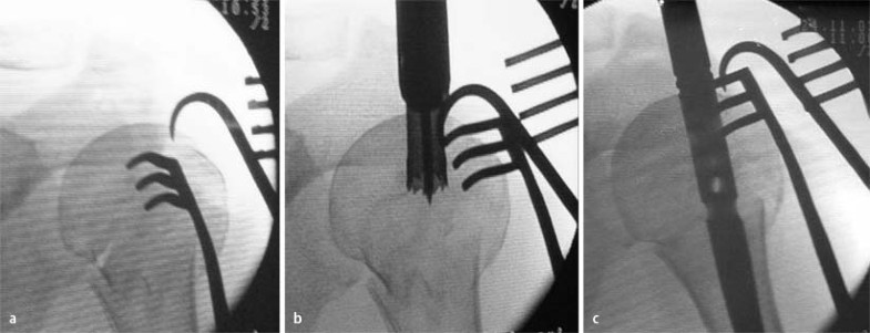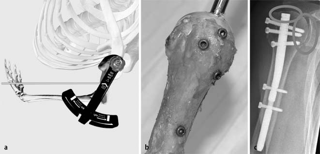 Nach Positionierung des Nagels wird die proximalste Schraube einen Querfinger hinter dem Sulcus bicipitalis ins Tuberculum majus eingebracht. Bei korrekter Positionierung zeigt sie ins Zentrum der Kalotte (Abb. 5 b). Danach werden die übrigen proximalen Schrauben gesetzt. Der um 90° angewinkelte Unterarm dient bei der Ausrichtung der Rotation als Orientierungshilfe: Er wird mit einem im Zielinstrument befestigten Kirschner-Draht in eine Linie gebracht (Abb. 5 a). Die distale Verriegelung sichert die Rotation. Zuletzt werden besonders bei osteoporotischen Verhältnissen oder Zertrümmerung der Tuberkel großzügig Sicherungsnähte zur Fixierung der Rotatorenmanschette an den Schrauben verwendet. Wesentlich für die spätere Funktion sind die exakte anatomische Reposition und die ausreichende Fixierung der Tuberkel. Ist die Konstruktion fertig gestellt, werden die Kalotte ähnlich einem Hut auf der Stange gehalten und die Gelenkfläche durch die verschiedenen Schrauben in mehreren Ebenen abgestützt (Abb. 5 c).