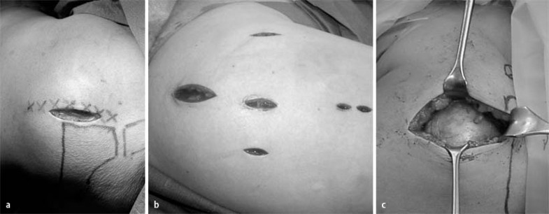 a Hautinzision (Mini-open-Technik): bei Bedarf Schnitterweiterung nach lateral möglich, b minimalinvasiver Zugang bei geschlossener Reposition, c Darstellung der Supraspinatussehne