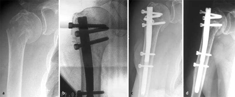 Die Plattenosteosynthese verwenden wir bevorzugt bei jüngeren Patienten, bei denen die gute Knochensubstanz ausreichende Stabilität zur Verankerung der Schrauben bietet und bei denen durch die zu empfehlende Implantatentfernung im Fall des Marknagels ein zweiter Gelenkeingriff mit erneuter Irritation der Supraspinatussehne resultieren würde. Die verschiedenen Schraubenpositionen und die größere Anzahl der Schrauben bieten bei den Plattensystemen bessere Optionen zur Versorgung der Head-Split-Frakturen [4].