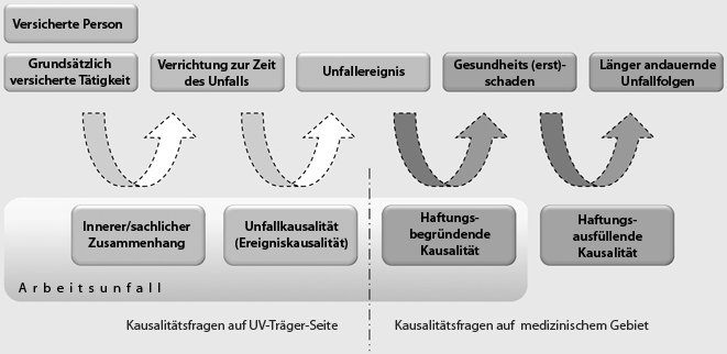 Für einen Arbeits- bzw. Schulunfall1 ist es in der Regel erforderlich, dass die Verrichtung des Versicherten zur Zeit des Unfalls der versicherten Tätigkeit zuzurechnen ist (innerer bzw. sachlicher Zusammenhang), diese Verrichtung zu dem zeitlich begrenzten, von außen auf den Körper einwirkenden Ereignis – dem Unfallereignis – führte (Unfallkausalität) und das Unfallereignis einen Gesundheitserstschaden oder den Tod des Versicherten verursachte (haftungsbegründende Kausalität). Das Entstehen von länger andauernden Unfallfolgen aufgrund des Gesundheitserstschadens (haftungsausfüllende Kausalität) ist keine Voraussetzung für die Anerkennung eines Arbeitsunfalls, sondern beispielsweise für die Gewährung der Rente (Abb. 1, [4]).