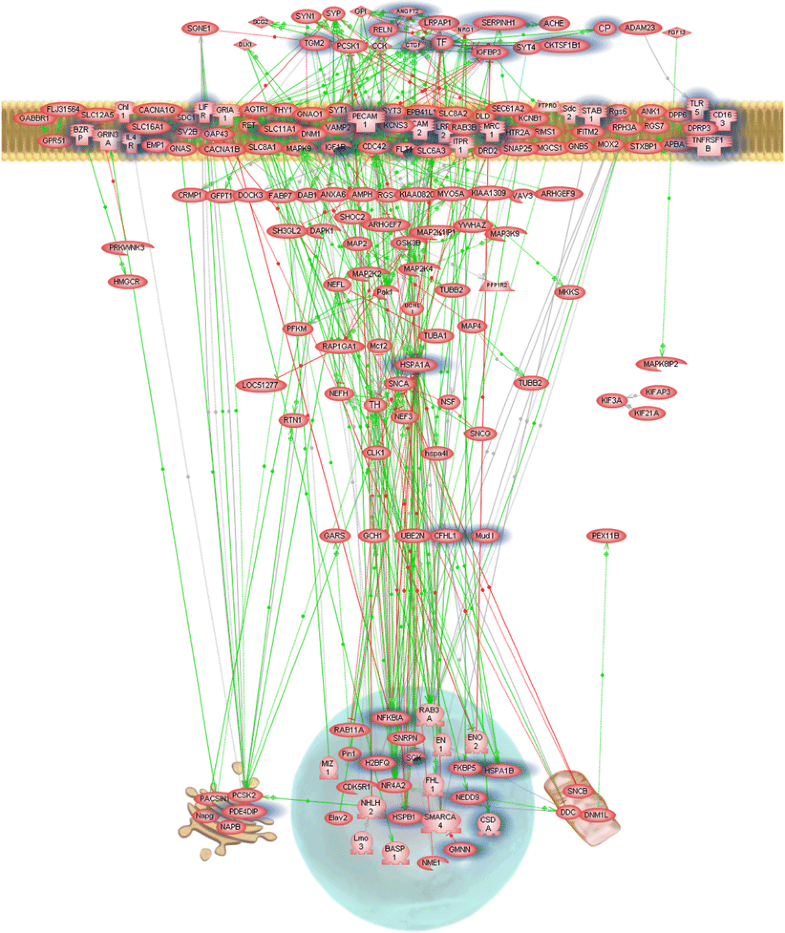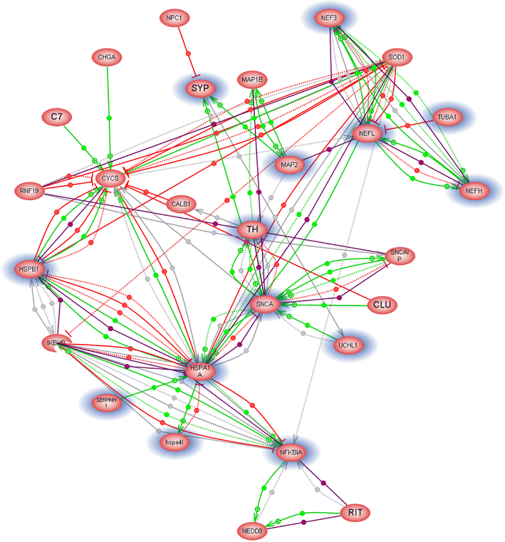 Neuronal pathway containing proteins found in Lewy bodies [11]. Priority genes of this study are marked by the blue shading. An online version of this figure with hyperlinks and an overlay of expression values is provided as SI_Figure_6. Symmetrical layout, display by effect (PathwayStudio)