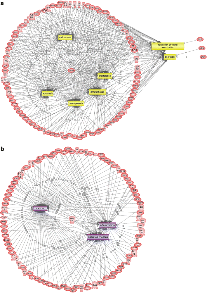 a Cell processes predicted to be influenced by the top up-regulated priority genes (164 genes showing a differential expression >1 log2) based on in silico analysis employing the ResNet database (PathwayStudio 5.0, Ariadne). P and expression values of all 1,145 probes can be found in SI_Table_1c. An online version of this figure with hyperlinks is provided as SI_Figure_3a. b The three disease conditions showing the strongest biological association with the group of top up-regulated priority genes which may serve as drivers of the disease process underlying PD. In silico analysis was performed employing the ResNet database of molecular interactions (Pathway-Studio 5.0, Ariadne). An online version of this figure with hyperlinks is provided as SI_Figure_3b