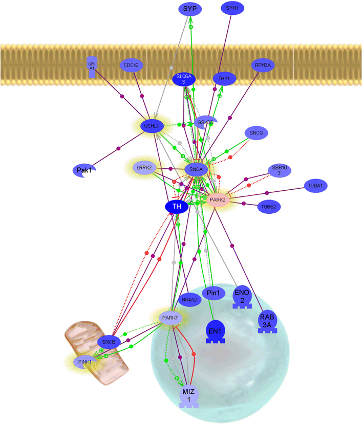 Hypothetical ‘super pathway’ not stratified for cell type illustrating known direct interactions between the 892 PD priority genes (regulation, expression and promoter binding only). A total of 417 interactions (relations) are shown and any unlinked entities were removed. Display style: by effect; cellular layout; colour codes: promoter binding, violet; green, positive regulation; red, negative regulation; grey and/or broken lines, unknown (Resnet 5.0 database, unedited). Blue shading around selected genes indicates their involvement in the cellular process and disease conditions depicted in Fig. 2a and b, respectively. Permutations of this figure with hyperlinks are provided online as SI_Figures_4a-c