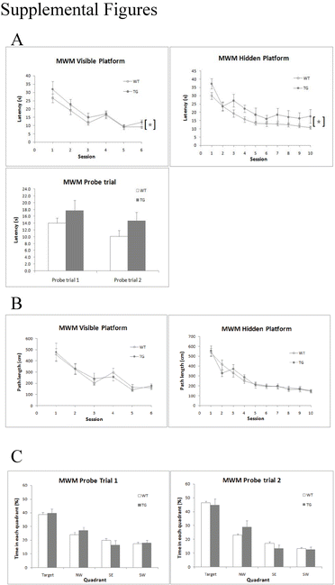 TG mice and WT littermate controls showed similar learning and memory ability in the Morris water maze test. a Latency in the visible and hidden platform training sessions and in probe trials. The greater latency in the TG mice likely reflects their slower swimming speed. b In visible and hidden platform training sessions, TG and WT mice had similar path lengths. c In the probe trials, TG and WT mice spent similar amounts of time in each quadrant. Values are mean ± SEM; *p < 0.05 (ANOVA)
