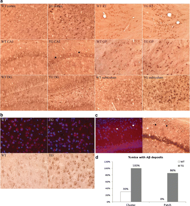 Amyloidosis in COL25A1 TG mice. a Immunohistochemical staining with Aβ antibody shows prominent Aβ accumulation in the cortex, CA1, DG, subiculum, reticular thalamic nuclei (RT), and globus pallidus (GP) in 1-year-old TG mice but not in WT littermates. b Immunofluorescence and immunohistochemical staining with Aβ antibody shows punctuate intracellular accumulations in TG mice. WT littermates displayed only background Aβ staining. c Immunofluorescence and immunohistochemical staining reveals extracellular protofibrillar Aβ deposits in hippocampal CA1 region in TG mice. White arrows indicate Aβ clusters; black arrows indicate Aβ patches. d Extracellular Aβ deposits in 12–16-month-old TG mice (n = 7) and WT controls (n = 10)