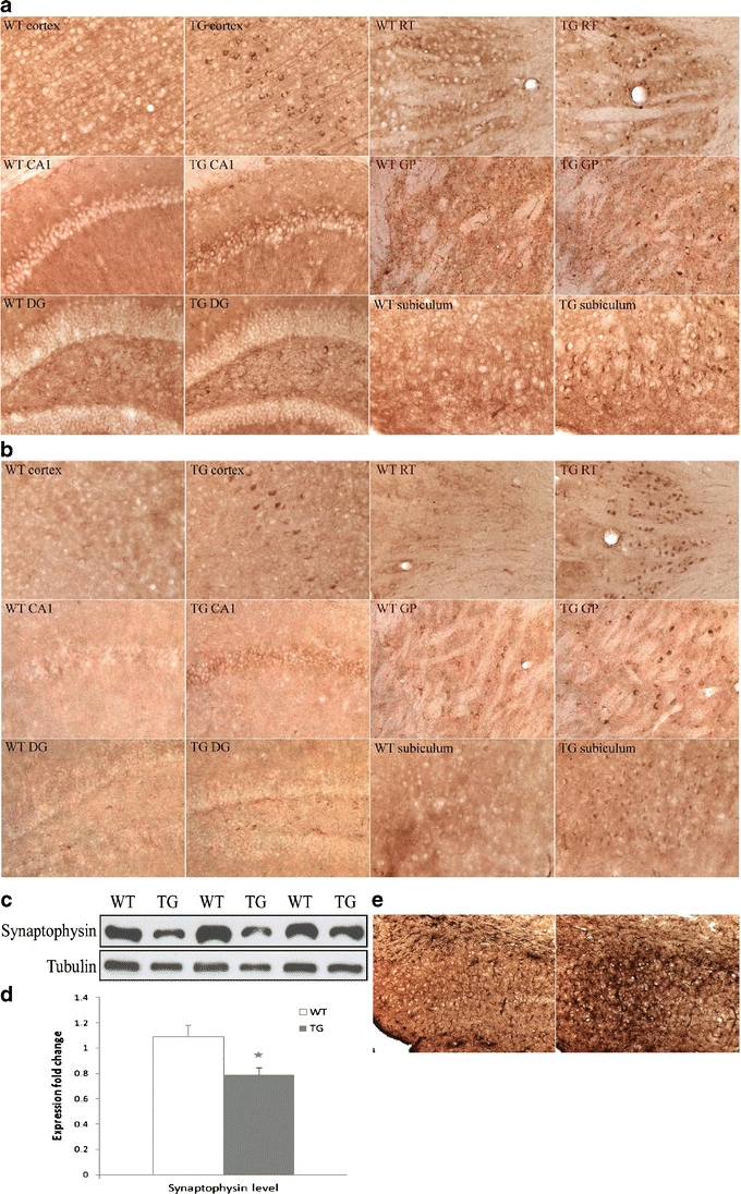 Molecular changes in COL25A1 TG mouse brains. a, b Immunohistochemical staining shows greater BACE1 (a) and p35/p25 (b) immunoreactivity in cortex, CA1, DG, reticular thalamic nuclei (RT), globus pallidus (GP), and subiculum of TG mice than WT littermates. c, d Western blot analysis of forebrain extracts shows synaptophysin loss in TG mice. Values are mean ± SEM; * p < 0.05 (t test). e Immunohistochemical staining of brain sections with anti-GFAP antibody shows astrocyte activation in the subiculum of TG mice