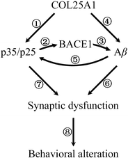 Hypothetical model of the AD-like pathogenic process in COL25A1 mice. Over-expression of COL25A1 (1) leads to increased p35/p25 levels (2), which promote BACE1 expression and (3) accelerate Aβ generation and accumulation. 4 Direct binding of COL25A1 to Aβ exacerbates Aβ accumulation and deposition. 5 Accumulated Aβ causes dysregulation of p35/p25. Together, Aβ accumulation (6) and dysregulated p35/p25 (7) induce synaptic dysfunction, which leads to the behavioral changes (8) in COL25A1 TG mice