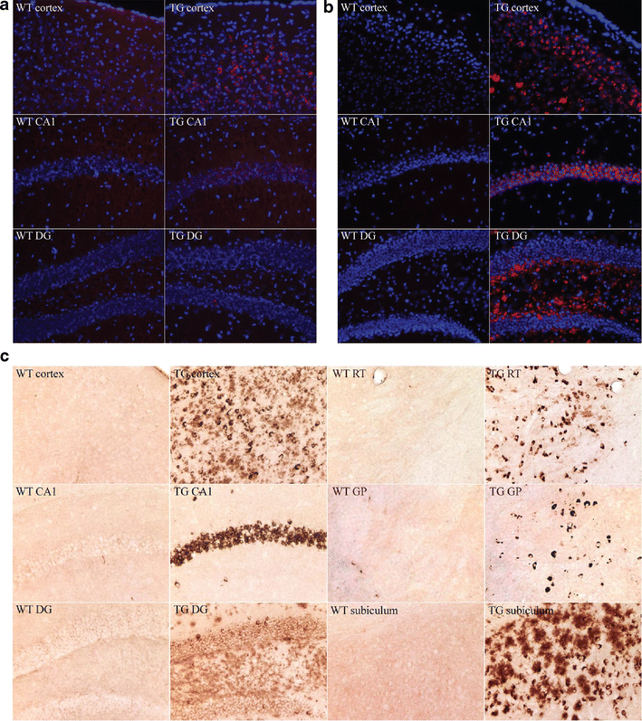 COL25A1 expression in TG mice begins in cortex and progresses to hippocampus. a Immunofluorescence staining of 2-month-old mouse brains. Cortical neurons were stained with NC4 antibody (red) in TG mice but not in WT littermate controls. Sections were counterstained with DAPI to identify nuclei (blue). b Immunofluorescence staining of 6-month-old mouse brains. Cortex, CA1, and DG were stained with NC4 antibody (red) in TG mice; the extracellular secreted form of COL25A1 was also detected in the DG. WT littermates showed no staining. c Immunohistochemical staining of 1-year-old mouse brains. NC4 staining was prominent in cortex, CA1, DG, reticular thalamic nuclei (RT), globus pallidus (GP), and subiculum in TG but not in WT control mice. Both precursor and secreted forms of COL25A1 were detected