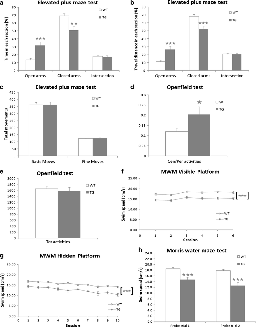 Behavioral alterations of COL25A1 TG mice. a – c In the elevated plus maze, TG mice spent significantly more time (a) and traveled longer distances (b) in the open arms than WT littermates. They also spent less time (a) and traveled smaller distances (b) in the closed arms. No difference was found between these two groups in the intersection. Total basic and fine movements of TG mice were not different from WT littermates (c). d, e In the open field test, TG mice spent more time exploring the central zone than WT controls, resulting in a higher ratio of central to peripheral activity (d). Total locomotor activity was similar in the two groups (e). f–h In the Morris water maze, the swimming speed of TG mice was significantly slower than that of WT controls in the visible (f) and hidden (g) platform training sessions and in the probe trials (h). TG (n = 13) and WT littermates (n = 22) were used. Values are mean ± SEM; *** p < 0.001, ** p < 0.01, * p < 0.05 (ANOVA)