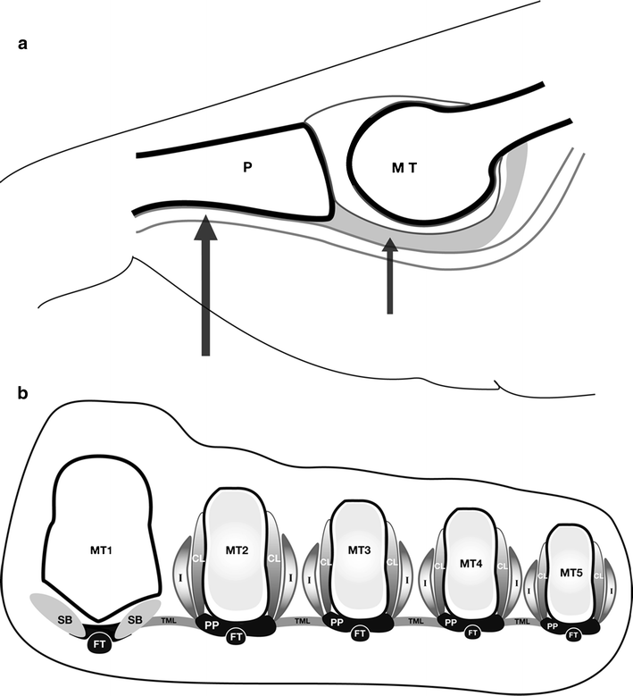 a Sagittal illustration through the lesser MTP joint, the plantar plate (short arrow) inserts into the proximal phalanx (P) and the flexor tendon (long arrow) lies adjacent to the plantar plate. b Short axis illustration through the forefoot, proximally the plantar plate (PP) attaches to the metatarsal shaft (MT) with the two collateral ligaments (CL) providing the most substantial attachment of the plantar plate to the metatarsal. The dorsal interosseous tendon (I) with the accessory CL insert into the dorsal aspect of the plantar plate. The flexor tendon sheath (FT) lies immediately plantar to the plantar plate and the deep transverse metatarsal ligament (TML) runs between the metatarsals attaching to the plantar plates
