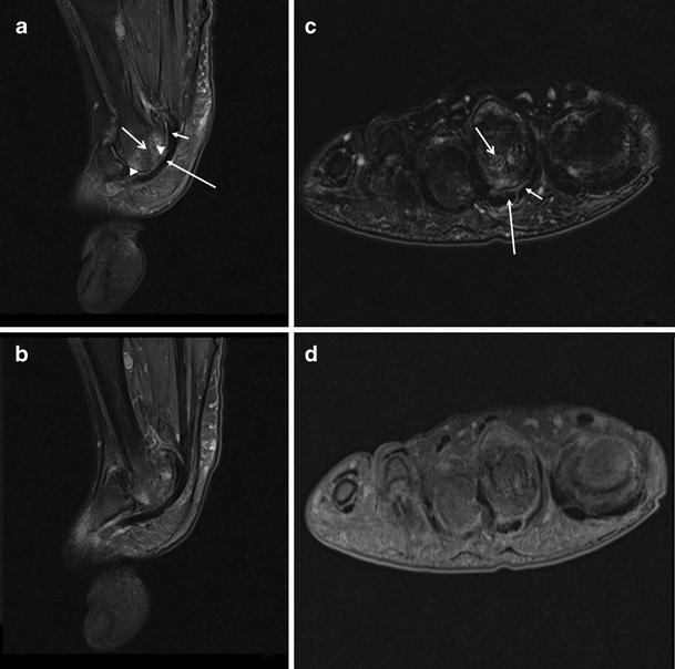 Images through the MTP joints of a patient with RA showing synovitis, bone marrow oedema and bone erosion. a Long axis T2-weighted fat-suppressed image showing extensive bone marrow oedema (white arrows). b Sagittal post contrast T1-weighted image showing synovitis (black arrow). The plantar plate is absent and synovitis extends from the joint to the flexor tendon. c Long axis and d short axis reconstructions from T1-weighted post contrast 3D VIBE images, again showing synovitis (black arrows) and erosion of the metatarsal heads (black arrowheads)