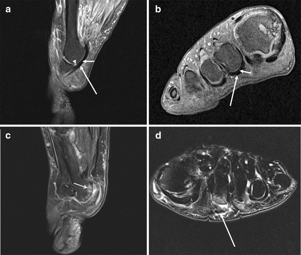 a Sagittal intermediate-weighted and b short axis T1-weighted fat suppressed images through the second MTP joint of a patient with RA showing an intact plantar plate (arrow), deep to the flexor tendon (long arrow). Small amount of high signal is seen at the insertion of the plantar plate into the proximal phalanx centrally (arrowhead), a common finding. (Cystic change is noted in first metatarsal head). c Sagittal intermediate-weighted and d short axis T2-weighted fat-suppressed images through the second MTP joint of a patient with RA. There is dislocation of the joint and the plantar plate is not visualised. There is bone marrow oedema (open arrow). On short axis section, fluid can be seen tracking from the joint around the flexor tendon sheath (arrow)