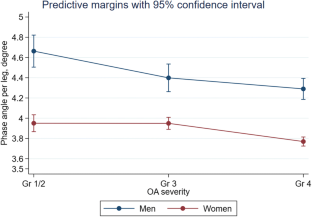 Key Points • PhA gradually decreased with increasing severity of KOA, especially in men. • Increasing PhA was associated with increasing quadriceps strength. • Clinicians should focus on increasing muscle mass and PhA. |