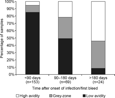 In pregnancy, the most important requirement for a CMV IgG avidity assay is to help in identifying or excluding a primary infection occurring in the previous 3 months in women presenting with a positive CMV IgM result. To reflect this, the sequential samples from all three centers were divided into three time points: <90 days, 90–180 days, and >180 days after the onset of infection. The majority of samples taken <90 days after infection onset were reported as containing low-avidity CMV IgG and the majority of samples taken >180 days after infection onset were reported as high-avidity CMV IgG by the Elecsys® CMV IgG Avidity assay. A mixture of low-avidity, gray-zone, and high-avidity results (49 %, 29 %, and 22 % of samples, respectively) were observed in samples taken 90–180 days after infection onset. The latter observation is consistent with the fact that the kinetics of the IgG avidity maturation process is likely to vary between individuals. Because of this, low-avidity IgG can be detected later than 90 days after infection onset for some patients [8, 9], with a delay in IgG avidity maturation specifically observed in some pregnant women. This could explain why low-avidity results were reported for almost half of the samples taken 90–180 days after infection onset in this study. Differences in the method used to ascertain the date of infection onset at the three sites in this study may also contribute to this variation.