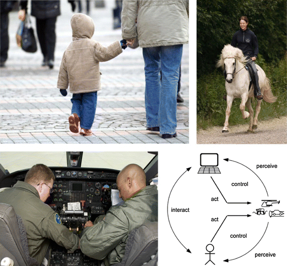 Applied to movement, cooperation is also a common concept in the non-technical world. Imagine a crowd of people moving along a street, including a parent and a child walking hand-in-hand. Another example would be a driver and a horse both influencing the course of a horse cart, or a pilot and a co-pilot alternatively controlling an airplane. Differences and interplay of abilities, authority, control and responsibility shape out different characteristics of those cooperative movement systems.