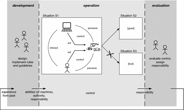 For human–machine systems, the behaviour of the machine (i.e. its abilities, the amount of control it exercises and the distribution of authority and responsibility between human and machine) is determined outside in the meta-system. The meta-system includes, among others, the equipment and people responsible for the development and the evaluation, see Fig. 2. This determination is done usually before and after the operation phase, e.g. during the development phase or in an after-the-fact evaluation phase, e.g. in case of an accident. An important feedback loop is running via the meta-system, where experience is used to enhance the system design for future systems.