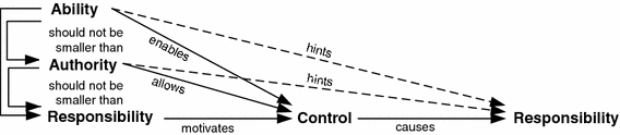 The most evident relationship is between ability and control: Ability enables control, or in other words, no successful control is possible without sufficient ability. Second, the appropriate authority is needed to be allowed to control. Note, however, that control does not occur automatically once the ability and authority exist; the actor still needs to execute control. A certain subjective or objective responsibility might motivate him to do so. Depending on the a priori responsibility and the control actions, a final responsibility results, leaving the actor accountable for his actions.