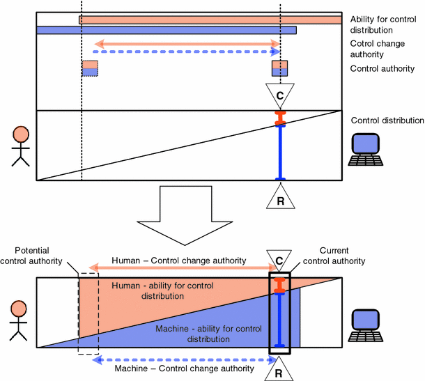 The authority to change the control distribution is indicated by arrows that symbolize the scope and direction in which human (top arrow) and machine (bottom arrow) are allowed to change the control distribution. In this example (Fig. 7), the human is allowed to change the control distribution (for both human and machine) in both directions (indicated by solid arrow), while the machine is only allowed to propose a change in control (indicated by dashed arrow), but not to change the control distribution directly.