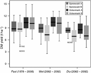 Multispecies legume-grass swards (LGS) within crop rotations are the primary source for nitrogen and livestock forage in organic farming systems (OFS) in Europe. At the same time, LGS are very susceptible to the effects of climate change on OFS in dryer regions. In order to predict changes in annual and seasonal LGS yields, the number and dates of LGS cuts and drought impact, an empirical statistical yield model based on alfalfa (A) and red clover (B) was applied to two of the driest areas within Germany: the ‘Spreewald’ (SP), with sandy soils only suited for red clover and the ‘Uckermark’ (UM) with sandy loams. Weather data series from 1972 to 2008 and two regional warming scenarios for 2062–2092, namely ‘Dry’ and ‘Wet’, were used to calculate the impacts. Only the scenario ‘Dry’ predicts an annual yield reduction (about 20 %), for both regions. This impact can be attributed to (1) the first cut is early by four weeks (decreasing the yield by 0.5 t ha−1), (2), the third cut is often delayed (caused by water deficiency) and (3) eventual impracticality of a fourth cut. In contrast, the second cut increased by 1 t ha−1 for ‘Wet’. In SP, frequent severe drought impacts are predicted for red clover LGS. This deleterious impact of the ‘Dry’ scenario can be partially compensated only in UM when alfalfa is used, which showed lower susceptibility to drought. Along with the predicted yield reduction, an increased vulnerability of organic farms in both study regions cannot be prevented.