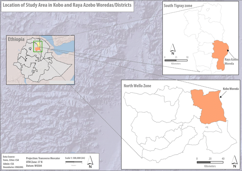 Our analysis is based on a qualitative, single case study design where we combine within-case spatial variation with temporal variation to gain insights into the adaptation experiences of male- and female-headed households, respectively. We used purposeful sampling to select two drought-prone districts from Northern Ethiopia and two Kebele’s from within these districts, considering the presence of persistent drought and erratic nature of rainfall. In our sample selection strategy, we tried to keep control variables that regard ethnicity, occupation and other socio-economic indicators constant, to the extent that that was possible. In agreement with, for example, Gerring (2001) and Yin (2013), we assume that whereas external validity is obviously compromised by the relatively small-N character of our study, the in-depth exploration of the two communities (that can be assumed to represent a larger pool in the region) may inspire the formulation of innovative working hypotheses for future research.