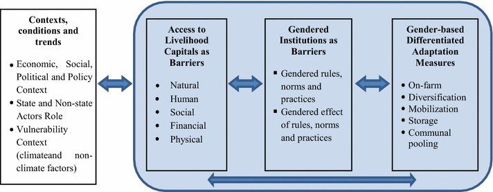 In the framework, the first and core component regards gendered institutions as barriers to adaptation. This concept emphasises both formal and informal institutions, and as such also captures social, cultural, and governance barriers (IPCC 2014a). This component focuses on two analytical notions—gendered rules, norms and practices and gendered effects of rules, norms and practices. The framework recognises and allows for the analysis of gender at the individual, household and community levels (see also Behrman et al. 2014). However, since the household is the unit of analysis in this study, such issues are examined here primarily from the experiences at household levels.