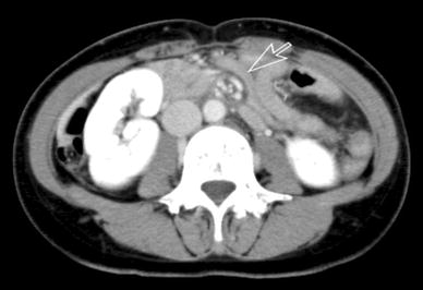 Early phase of enhanced computed tomography (CT) scan shows swirled appearance and twisting of the mesenteric artery (arrow, whirl sign) in a patient 443 days after laparoscopy-assisted distal gastrectomy (LADG)
