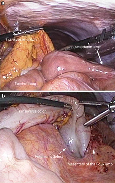 As for the position of the Roux limb, the retrocolic route in laparoscopic RYGBP has three potential sites for internal hernia, namely, the transverse colon mesentery, Petersen’s defect, and the enteroenterostomy site [8, 9, 10]. Recently, many authors have preferred the antecolic route for the Roux limb, which reduces the potential sites for hernia from three to two, including Petersen’s defect after a laparoscopic RYGBP [10, 20, 21]. As for the route, the antecolic route may be better because it eliminated one of the most common sites for herniation, the mesocolon, as for laparoscopic distal gastrectomy with R-Y reconstruction.