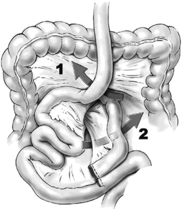 Internal hernia site after antecolic Roux-en-Y reconstruction (R-Y). 1 Jejunojejunal mesenteric defect; 2 Petersen’s defect, which is the space between the Roux limb and the transverse mesocolon