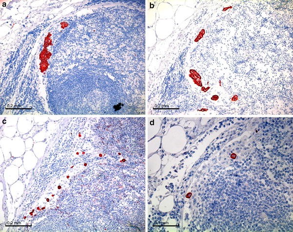 Sections of regional lymph nodes presenting metastasis by immunohistochemical staining with anti-pan cytokeratin antibody KL1. a, b Micrometastasis (0.2–2 mm, original magnification ×200), c micrometastasis with scattered single tumor cells (original magnification ×200), d two isolated tumor cells (≤0.2 mm, original magnification ×400)