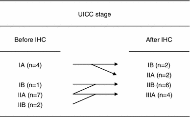Stage migration after immunohistochemical lymph node examination (IHC) according to the International Union against Cancer (UICC) staging system (n = 14)