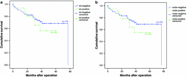 Kaplan–Meier overall survival curves for all 95 patients with histologically pN0 gastric cancer. There was no significant difference in survival time: a neither between patients with immunohistochemically classified mi-positive and mi-negative LN (log-rank test, p = 0.511), b nor between the groups with node-positive and node-negative findings (log-rank test, p = 0.386)