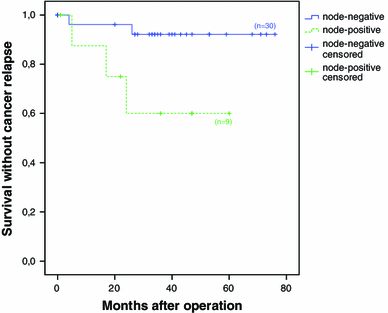 Kaplan–Meier time to recurrence curves for patients younger than 70 years (n = 39) classified as node-positive or node-negative by immunohistochemistry. Node-positive patients showed a significantly higher recurrence rate within this subgroup (log-rank, p = 0.026)
