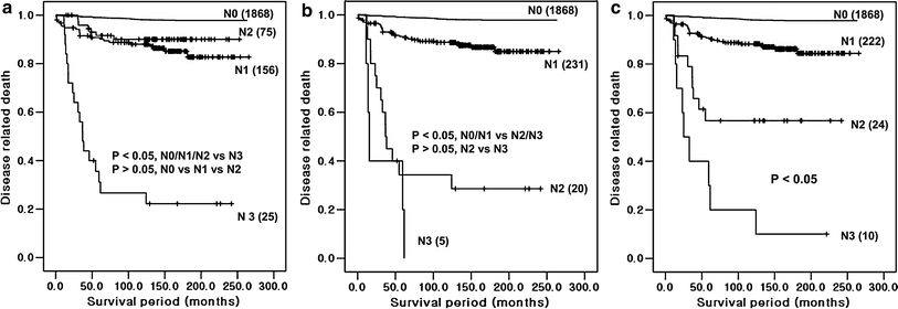 Survival by nodal stage. a There was no significant difference between N1 and N2 cancers in the seventh edition of the American Joint Committee on Cancer staging system. b There was no significant difference between N2 and N3 cancers in the sixth edition of the American Joint Committee on Cancer staging system. c Survival as defined by the proposed new nodal staging system. There were significant differences between N0 and N1 cancers, N1 and N2 cancers, and N2 and N3 cancers (p < 0.05); N1 corresponds to one to five lymph node metastases, N2 corresponds to six to ten lymph node metastases, and N3 corresponds to more than ten lymph node metastases