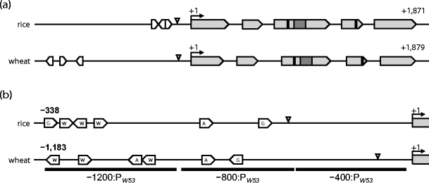 a Gene models for the WRKY53 orthologs in rice and wheat: both orthologs span five exons, represented by grey arrows; the two conserved WRKY domains are indicated by black bars; the zinc finger motif is indicated by a dark grey bar. The relative promoter positions of the W-box WRKY transcription factor binding motifs are indicated by open arrows. b Features of the promoter regions of the rice and wheat orthologs of WRKY53. Putative cis-acting regulatory elements are indicated by open arrows: A ABRE abscisic acid-responsive element; G GCC-box ethylene-responsive element; W W-box WRKY transcription factor binding motif. The regions amplified from TaWRKY53 for use in yeast one-hybrid assays are indicated by horizontal black bars