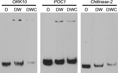 We infer from our data that WRKY53 is able to transduce this wide range of stress-responsive signals to several downstream targets. Particularly prominent in our study is the involvement of the oxidative burst and genes forming part of the pathogen defence repertoire, including GST, ORK10 and POC1 (Fig. 4). ORK10/LRK10 is a receptor kinase important in the fungal resistance response of cereals (Feuillet et al. 1997; Cheng et al. 2002; Marcel et al. 2010), and POC1 is an apoplastic peroxidase induced as part of the oxidative burst in response to aphids or pathogens (Young et al. 1995; Van der Westhuizen et al. 1998; Hilaire et al. 2001; Anguelova-Merhar et al. 2002). This is consistent with a regulatory role for OsWRKY53 during rice blast infection (Chujo et al. 2007) and TaWRKY53 during the resistance response to aphid attack (Van Eck et al. 2010) and implies that WRKY53 is a regulator of ROS release during the hypersensitive response (Fig. 5).
