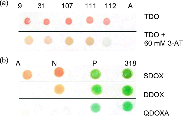 a Yeast one-hybrid interactions. Colonies 9–111 have the HIS3 reporter gene under the control of the −400:P W53 promoter segment. Colony 112 harbours an empty prey protein vector and acts as a negative control. The identities of the interactors are summarized in Table 2. A autoactivation control, TDO triple dropout SD/–His/–Leu/–Ura media, 3-AT 3-amino–1,2,4-triazole. b Yeast two-hybrid interactions. All colonies express the truncated WRKY53 protein from the pASGW::tW53 vector. Blue colour indicates the activation of the MEL1 gene. A autoactivation control, N negative control, P positive control; 318, positive interactor, a microsomal glutathione S-transferase. SDOX single dropout SD/–Trp/X-α-gal media; DDOX double dropout SD/–Leu/–Trp/X-α-gal media; QDOXA quadruple dropout SD/–Leu/–Trp/–Ade/–His/X-α-gal/AurA media