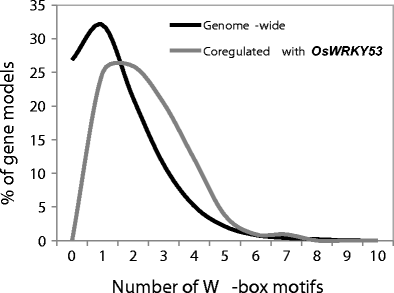 Frequency distributions of numbers of W-box motifs for all predicted gene models in the MSU rice genome annotation v6.1 (n = 67,393) compared to a subset of genes coregulated with OsWRKY53 (n = 96)
