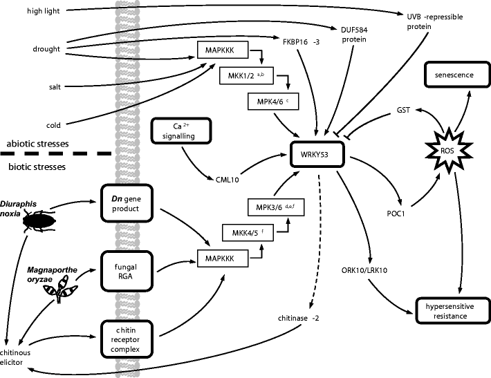 A gene network for WRKY53 in cereals. The WRKY53 transcription factor is able to receive many types of stress inputs, from both abiotic and biotic pathways, and transduce those to an appropriate oxidative burst. Our study suggests that CML10, FKBP16-3, a DUF584 protein and a UVB-repressible protein are upstream regulatory components, whereas GST, ORK10/LRK10 and the peroxidase POC1 are downstream targets of WRKY53 regulation. aIchimura et al. (1998), bTeige et al. (2004), cQiu et al. (2008), dWan et al. (2004), eMao et al. (2011), fAsai et al. (2002)