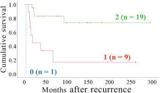 Twenty-nine of the 112 patients who relapsed underwent SCS. Complete resection was achieved in 18 (62%) patients, whose OS after SCS was significantly better than that of patients receiving incomplete resection (68 vs. 20 months; p = 0.001). Endometrioid histology and performance status (PS) 0 were significant and independent factors for a favorable OS (p = 0.005, and 0.049). The OS of patients with both factors was better than patients with one or no factors (median 75, 19 and 4 months; p = 0.001 and 0.00001). The number of predictors was associated with the rate of complete resection (p = 0.001).