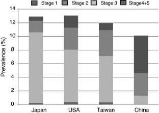 The prevalence of CKD stages 1, 2, 3, and 4 + 5 were 0.6, 1.7, 10.4 and 0.2% in the study population, which resulted in predictions of 0.6, 1.7, 10.7 and 0.2 million patients, respectively, nationwide. The prevalence of low GFR was significantly higher in the hypertensive and proteinuric populations than it was in the populations without proteinuria or hypertension. The prevalence rate of CKD in Japan was similar to that in the USA when the Japanese general population was age adjusted to the US 2005 population estimate.