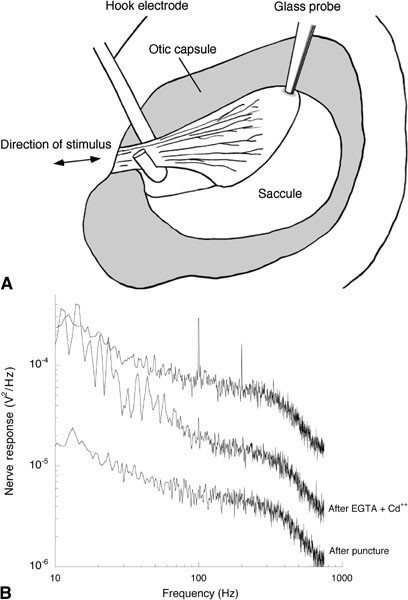 Preparation and typical electrophysiological responses. A. Saccular preparation. A small opening was made in the otic capsule allowing access to the saccular nerve. A glass probe glued to the sacculus was used to stimulate the organ and the afferent nerve activity was registered using a chlorided silver electrode hooked around the nerve. B. Power spectra of nerve responses, showing the f and 2f components of nerve activity. The top spectrum was obtained while the sacculus was bathed in a perilymph-like solution. The middle spectrum was obtained immediately after the bath was replaced with our no-calcium saline (which contains 1 mM EGTA) supplemented with 100 µM CdCl2. The bottom spectrum was obtained in the same no-calcium saline immediately after the sacculus was gently punctured with a pair of fine forceps. To avoid overlap the two bottom spectra were divided by 30 and 100, respectively. The sacculus was displaced 28 nm at 100 Hz. For clarity, peaks at 180 and 300 Hz were digitally removed. (The 180 Hz peak is a multiple of the line frequency. The 300 Hz peak is also a multiple of the line frequency, but it could also have a contribution from the saccular 3f component).