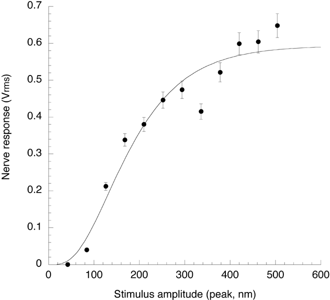 Displacement–response relationship for an individual sacculus. The stimuli consisted of 100 Hz sine waves of varying amplitude. The stimuli were applied in order of increasing amplitude for a period of 4 s and the signal detected by the lock-in amplifier was simultaneously recorded. Error bars are standard deviation. The data were fitted to the fourth order sigmoidal curve Y = A·(1−e−X/B)4, which is used only as a rough guide. The relationship was obtained automatically using a computer-controlled routine and a constant low sensitivity in the lock-in amplifier to prevent saturation at the larger stimuli. At this sensitivity, the responses to smaller stimuli are poorly resolved and it appears that there was no response for stimuli below 60 nm. However, at high sensitivity we observed well-behaved stimulus–response relationships for all stimuli used (not shown).