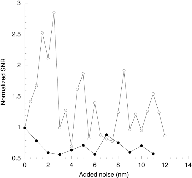 Improvement in the SNR of nerve activity with increasing noise levels. The preparation was stimulated at 100 Hz, with an amplitude of either 4.4 nm (clear symbols) or 44.2 nm (dark symbols)with varying amounts of low-pass-filtered white noise, and the SNR of the nerve response was recorded. The SNR improved only for the weak signal. To compare these SNR plots, each plot was normalizedto the SNR obtained in the absence of added mechanical noise.
