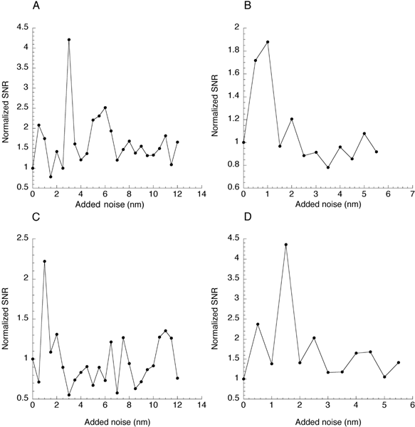 The SNR of the nerve signal was improved by the addition of nanometer-level noise to the small periodic stimuli in all responsive animals tested. In some cases the improvement of the SNR was above fourfold (Fig. 3). This enhancement depended on the amplitude of the stimulus, a characteristic of SR: When noise was added to large stimuli, it degraded the SNR of the response (note that SNR values are normalized and that the SNR in response to larger stimuli was larger). In a few cases we had preparations which were relatively unresponsive (i.e., they required periodic stimuli above ~30 nm to produce a peak in the power spectrum of the nerve’s response). In these cases we observed no improvement in SNR with increased noise levels. Similarly, in responsive preparations no changes in the SNR with varying levels of noise were detected after the preparation’s health declined, or after the nerve was intentionally damaged with the recording electrode. These results indicate that observed improvements in the SNR are not due to artifacts of stimulation or data acquisition. Examples obtained in four preparations (different from the one shown in Fig. 3) are presented in Figure 4. The average gain in the SNR for all preparations tested was 2.6 ± 1.0 (SD, n = 9). Peaks in the SNR plots occurred at an average noise level of 2.5 ± 2.2 nm, in agreement with previous work (Jaramillo and Wiesenfeld 1998).