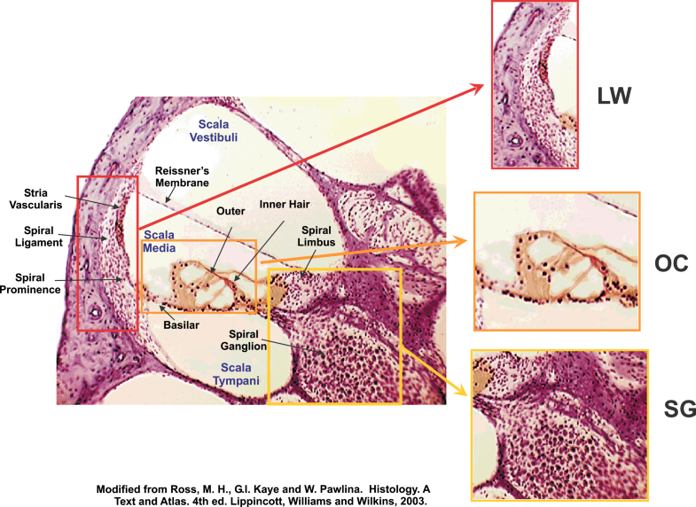 Dissection of the mouse cochlea. A histological representation of the dissected fractions of the mouse inner ear is depicted. Three functionally distinct regions of the cochlea were chosen for isolation and represent the lateral wall (LW) comprising the stria vascularis, spiral ligament and spiral prominence, the organ of Corti (OC), and the spiral ganglion (SG) neurons. All samples are comprised of tissue from all three turns including the basal hook region.