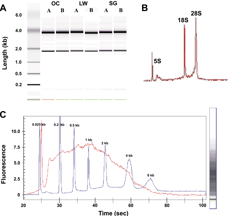 Assessment of total RNA and amplified RNA samples. Quality assessment of total and amplified RNA. Bioanalyzer gel image (A) of total RNAs is represented by duplicated samples from each of the three dissected cochlear regions. In each sample, the 28S, 18S, and 5S ribosomal bands are visible, and this is depicted by the bioanalyzer electropherogram (B) of total RNA isolated from the OC. (C) Bioanalyzer electropherogram of 1× amplified RNA (aRNA) from the OC overlaid on the corresponding electropherogram of a 6-kb RNA ladder (Ambion, Inc., Austin, TX). For all aRNA samples, the size range was about 100–6000 bases, with a midpoint of about 1000 bp.