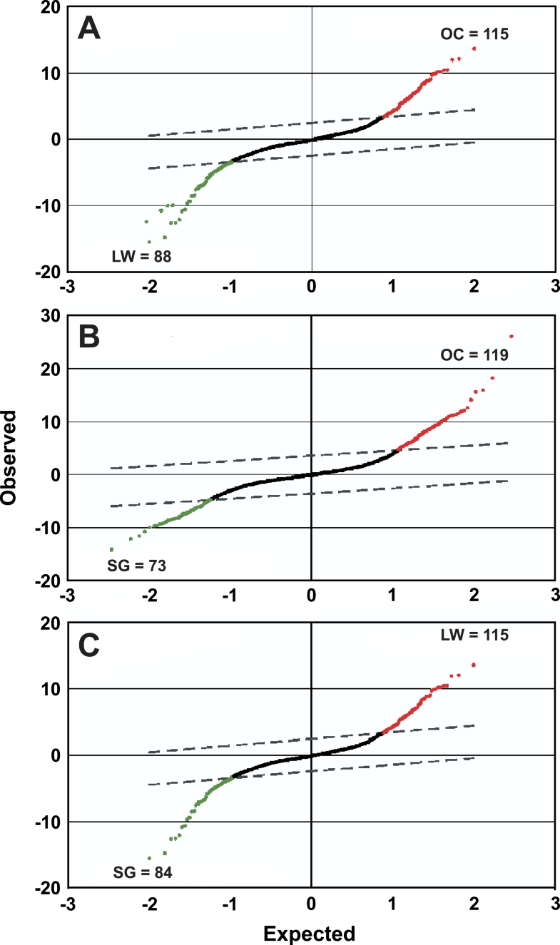 SAM plots for cochlear dissected fraction expression comparisons. Comparisons were made between LW vs. OC (A), SG vs. OC (B), and SG vs. LW (C). For each comparison, the total number significant, median number false significant, and delta value are shown. Significant differentially expressed genes are represented by either green (tissue 1) or red (tissue 2) data points shown outside of the delta cutoff lines. The delta value is set to maximize the significant data points and minimize the false significant.