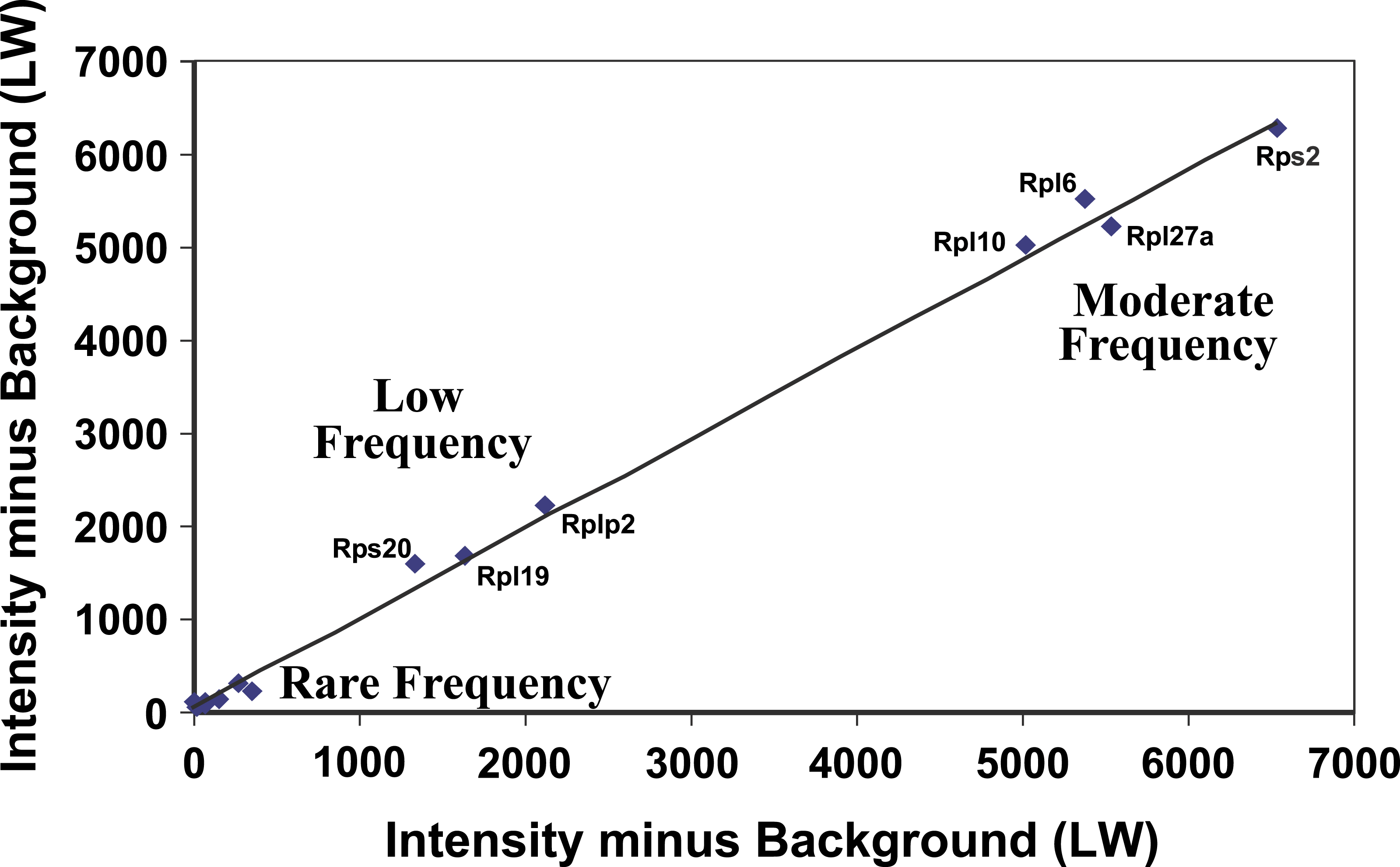 Utilization of genes specifying ribosomal proteins in normalization assessment. Intensity levels of a large set of genes specifying ribosomal proteins present on the array were examined. Data are for one of the organ of Corti versus spiral ganglion comparisons, but similar results were observed across all experiments. The ribosomal protein genes were categorized into high (>1000 ESTs), moderate (>500 ESTs), and low (<250 ESTs) expression levels based on the number of ESTs in the entire mouse GenBank database. Genes with moderate and low expression levels were cytoplasmic ribosomal proteins and are designated. Those with background signal levels were mitochondrial ribosomal protein genes and are Mrpl10, Mrpl51, Mrps9, Mrps16, and Mrps19a.