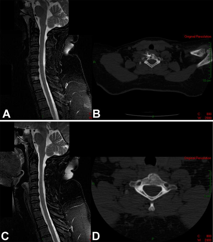 a Sagittal T2-weighted MRI with fat suppression of the cervical spine of a 43-year-old woman with a painful osteolytic lesion of the C7 vertebral body. b CT-guided frozen section biopsy showed eosinophilic granuloma; intralesional methylprednisolone injection was performed. c Sagittal T2-weighted MRI with fat suppression. d Axial CT scan show complete reconstitution of the lesion 4 years after diagnosis and treatment